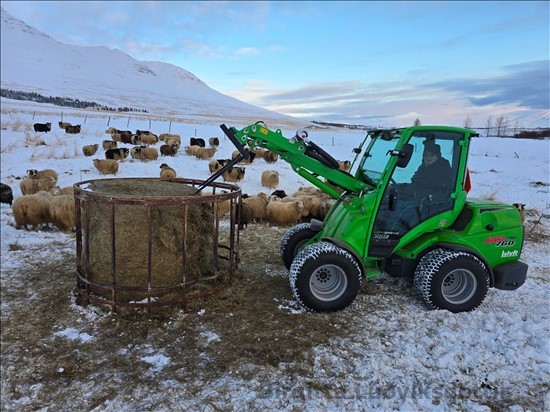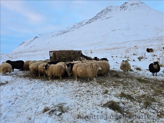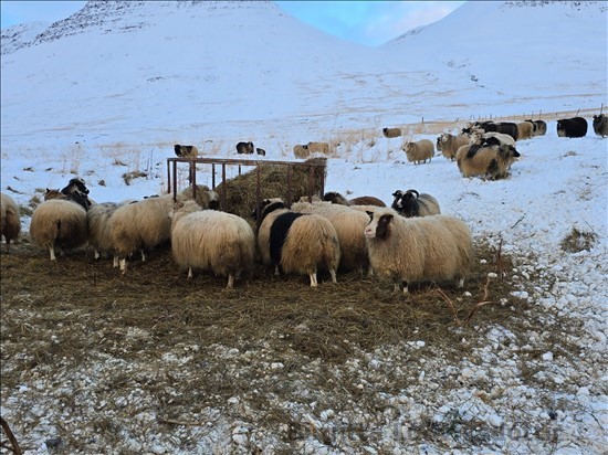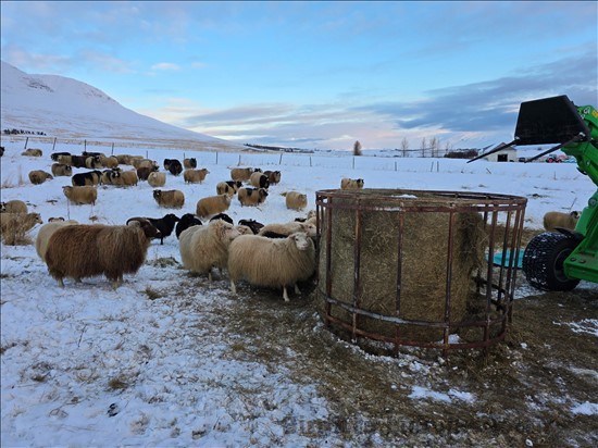 Við gefum kindunum hey úti, já og líka inni. Þær fara út á