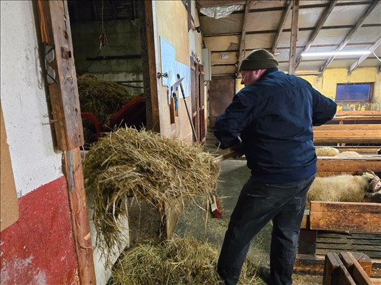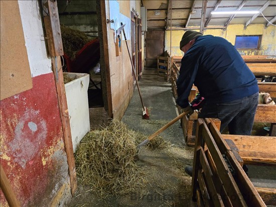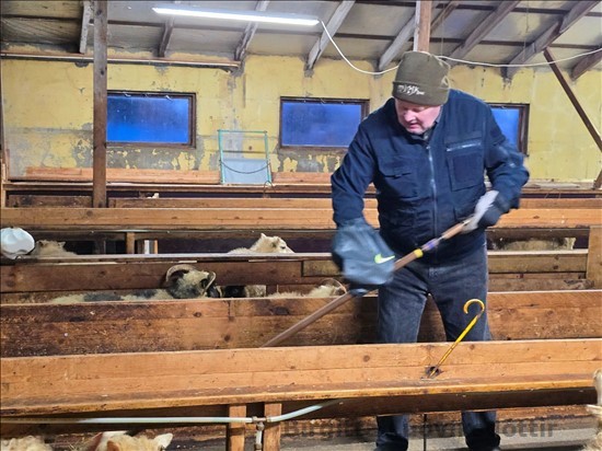 með mér í fjárhúsin. Hann tók ekki annað í mál, en að sópa
