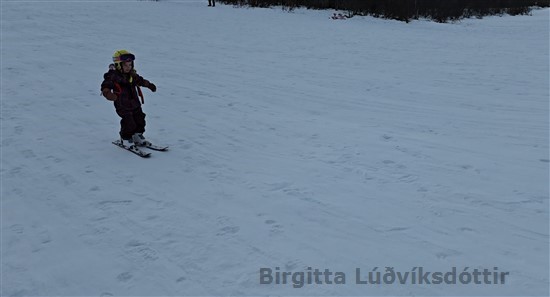Nafna mín að æfa sig að renna niður brekku á skíðum